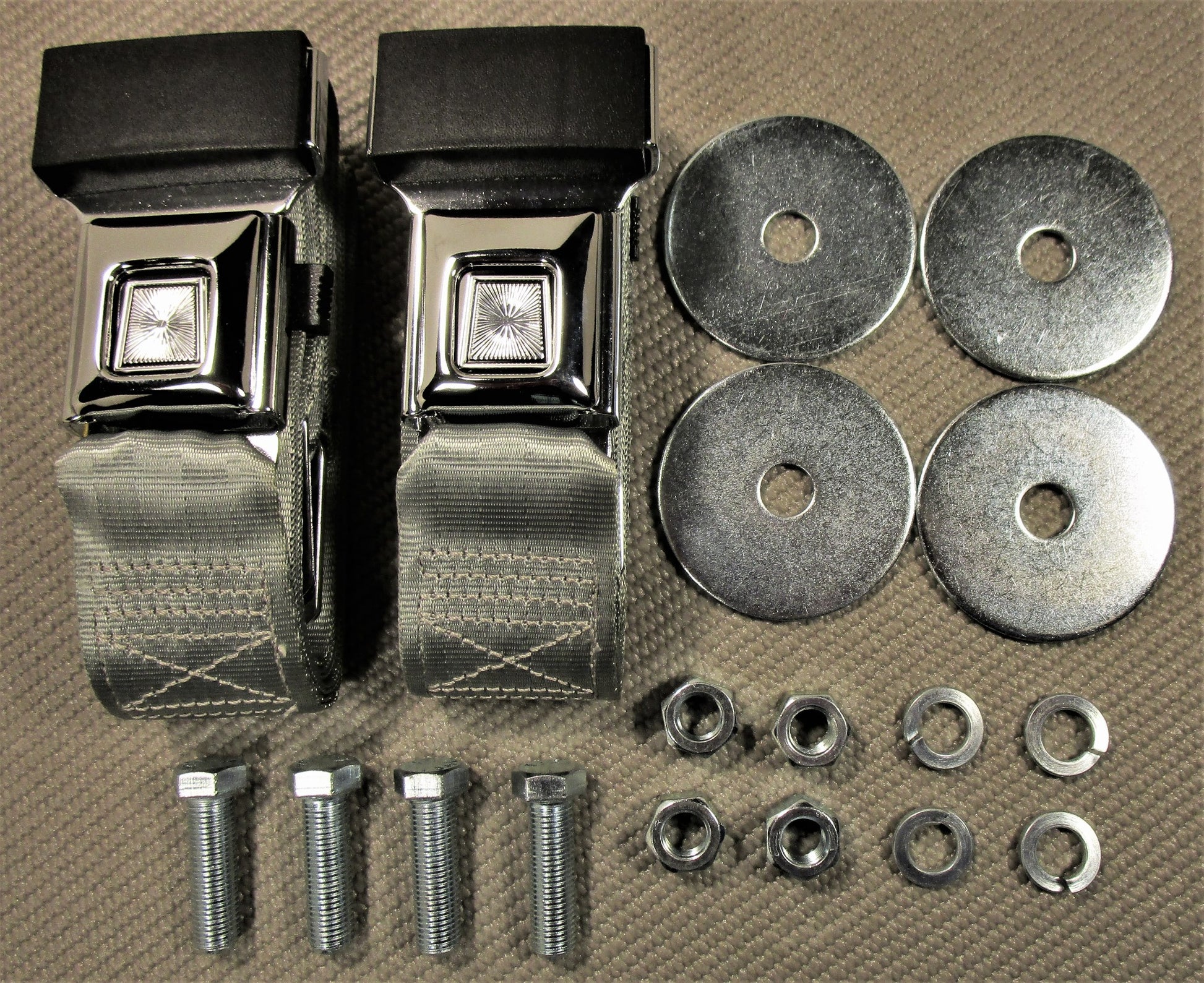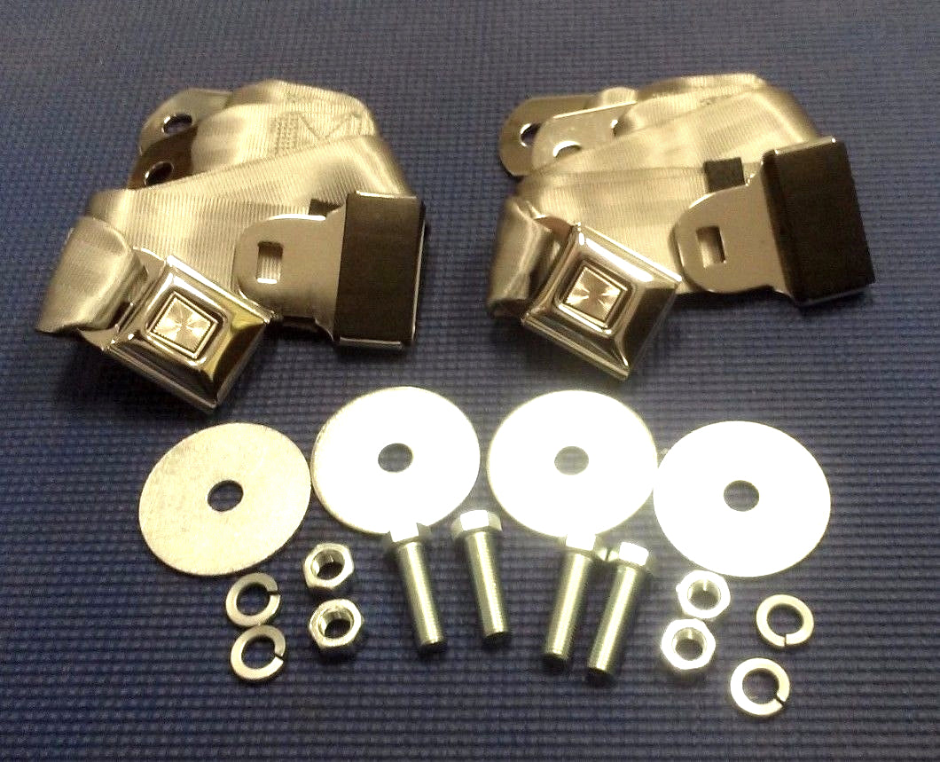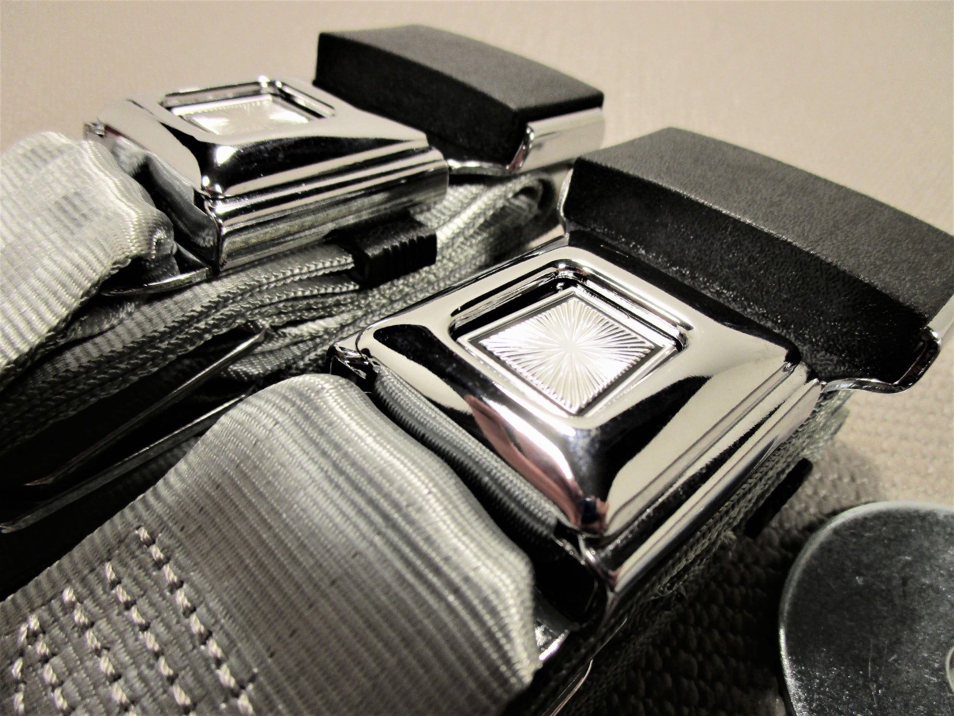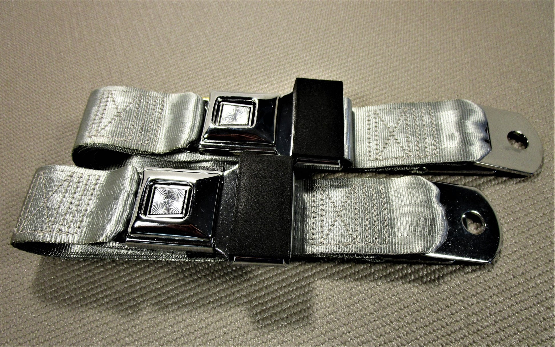 THIS SALE IS FOR 2 PAIRS OF CHROME O.E. STYLE WITH STARBURST PUSH BUTTON SEAT BELT SETS WITH HARDWARE IN A MEDIUM GREY SILVER FOR DRIVER AND PASSENGER. THIS ARE A GREAT STYLE FOR THE CHEVY PICK-UPS, THEY ARE 75" MEDIUM SILVER GREY SEAT BELT SETS THAT WORK WELL WITH CAR,TRUCKS, AND HOT RODS THEY COME WITH HARDWARE TO BE ABLE TO MOUNT THROUGH THE FLOOR BOARDS THEY ARE MADE OF HIGH QUALITY INCLUDING THE MECHANISM AND SEAT BELT WEBBING. THE CHROME IS VERY HIGH QUALITY (HIGH SHINE) AS WELL..